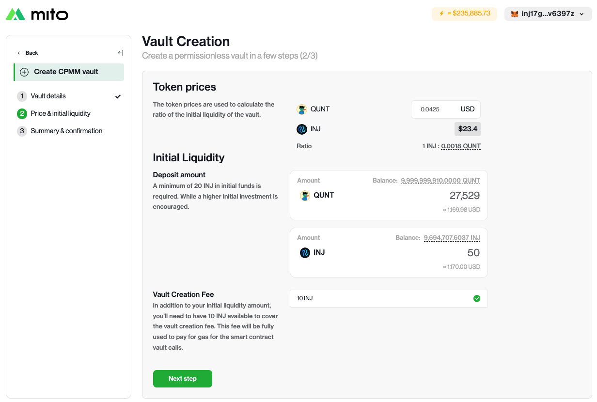 * During the vault creation process, a minimum first subscription of 50 INJ worth of base and quote assets is required to establish initial liquidity.